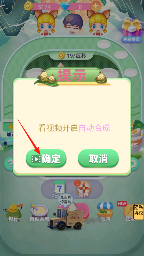 3、出現(xiàn)看視頻開啟自動合成提示,想偷懶的話點確定看個廣告,就能開啟自動合成功能,開啟后不用手動拖糕點,系統(tǒng)會自動把能合成的放一起,省心又省力金幣照樣嘩嘩漲。