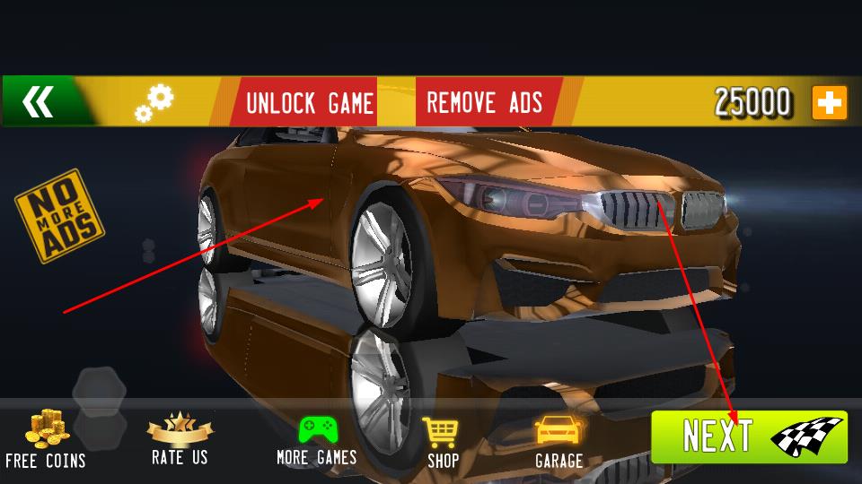1、在車輛選擇界面,然后就可以點擊右下角綠色NEXT按鈕,選定金色汽車,正式開啟競速挑戰(zhàn)。