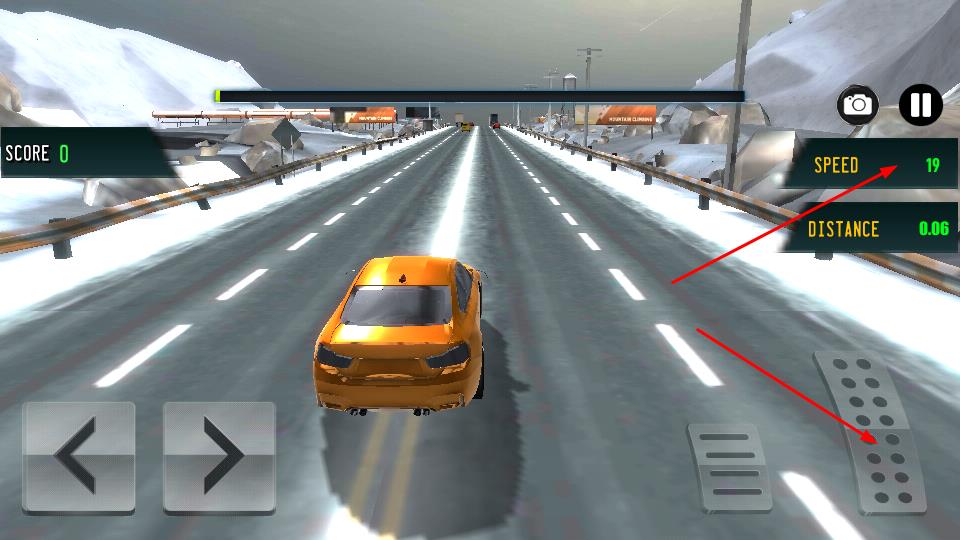 2、進入駕駛界面,左側(cè)方向按鍵控制轉(zhuǎn)向,右側(cè)踏板操控加速,留意上方速度、距離數(shù)據(jù),適應(yīng)冰雪路面行駛。