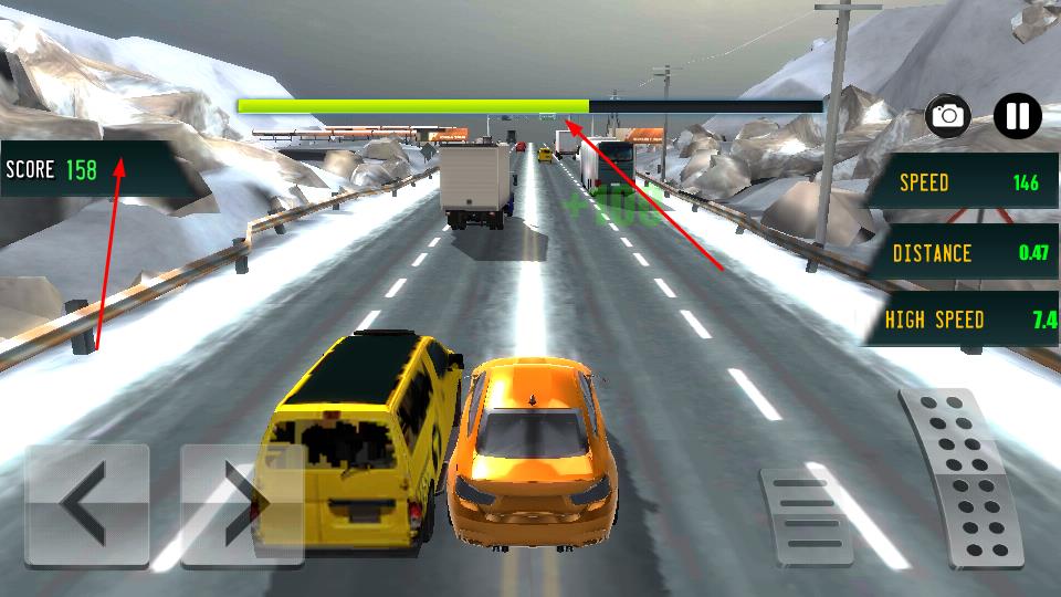3、行駛中避讓前方車輛,持續(xù)推進提升得分,關(guān)注左上角分數(shù)變化與上方進度條,爭取達成更高競速成績。