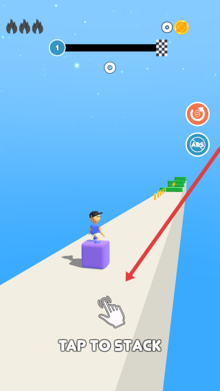 1、在游戲起始界面,依據(jù)TAP-TO-STACK提示點(diǎn)擊屏幕,使角色腳下堆疊方塊,為后續(xù)跨越道路障礙儲(chǔ)備前行基礎(chǔ)。