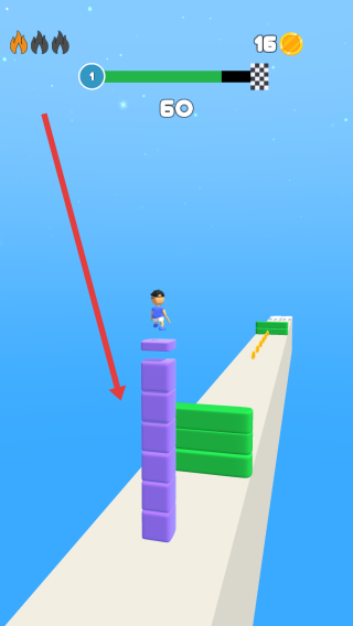 2、關(guān)卡中持續(xù)點(diǎn)擊屏幕堆疊紫色方塊,借助堆疊的方塊搭建通行路徑,助力角色跨越綠色障礙,推進(jìn)跑酷進(jìn)程。