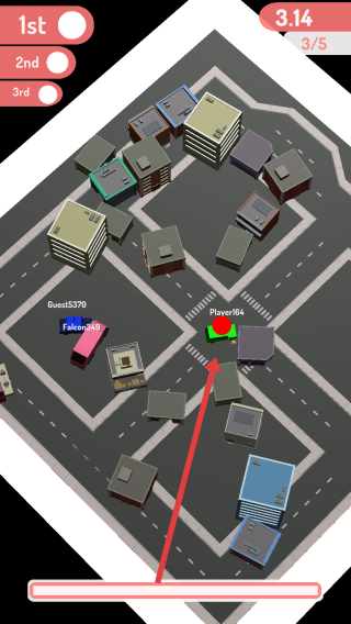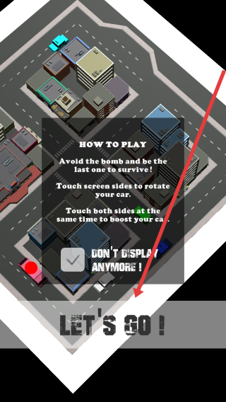 3、游戲中,點(diǎn)擊屏幕左右兩側(cè),操控紅色車輛移動(dòng),躲避炸彈襲擊,努力成為最后存活的玩家,完成關(guān)卡目標(biāo)。