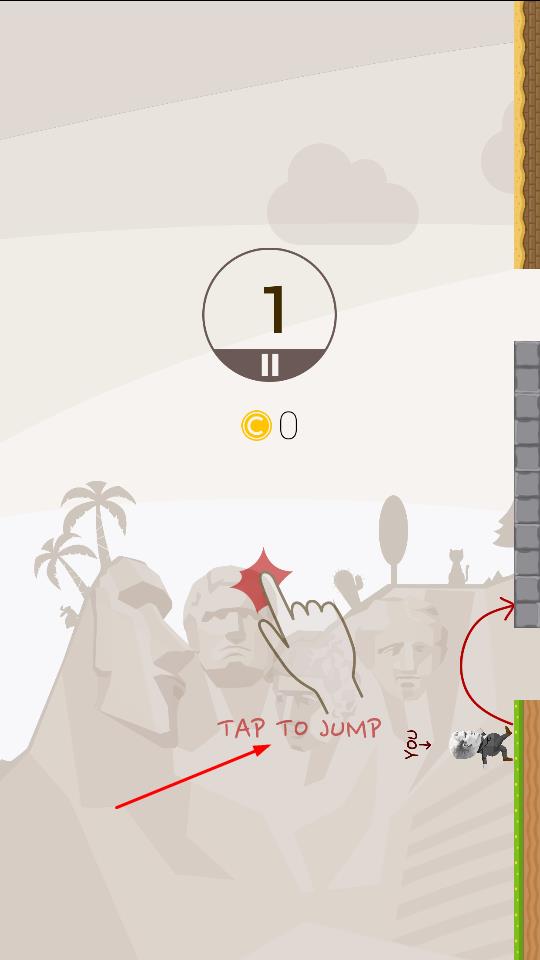 1、首先進(jìn)入游戲,依據(jù)TAP TO JUMP提示,點(diǎn)擊屏幕操控右側(cè)灰色角色跳躍,開啟關(guān)卡上方數(shù)字1標(biāo)識(shí)挑戰(zhàn)。