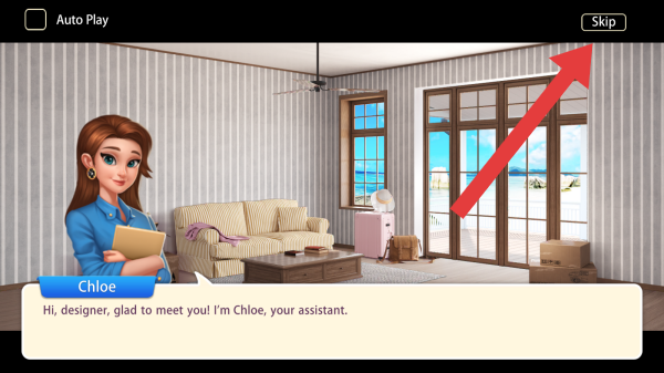 1、畫面呈現(xiàn)了室內(nèi)的場景,與角色進(jìn)行互動(dòng)對話交流,可點(diǎn)擊Skip跳過次對話框進(jìn)入下一步。