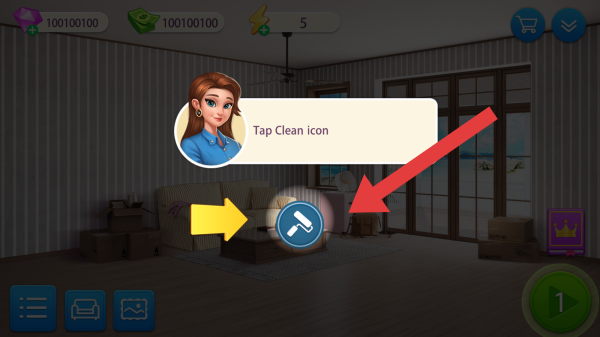 2、玩法規(guī)則:需要對室內(nèi)進(jìn)行重新翻新,根據(jù)提示點(diǎn)擊相對應(yīng)的圖標(biāo)進(jìn)行操作,屬于新手教程的指引。