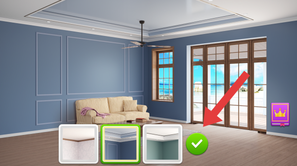 3、第一個(gè)重新改造的是墻壁,有三種不同的花色,可根據(jù)自身進(jìn)行選擇,選擇后點(diǎn)擊打鉤的圖標(biāo)確認(rèn)。
