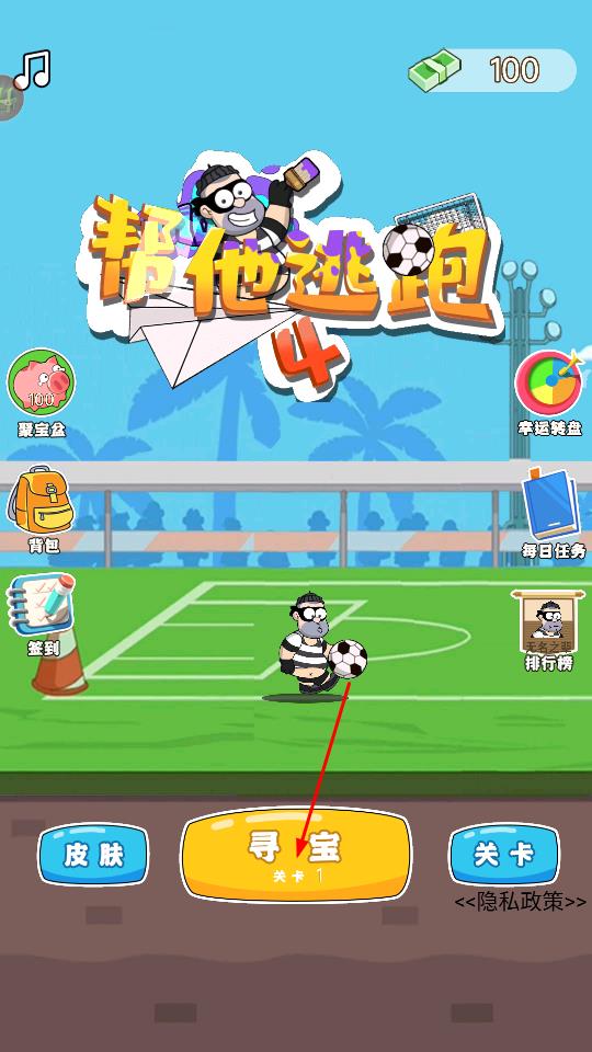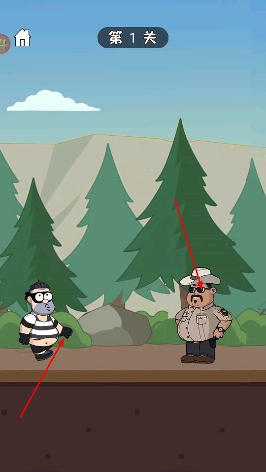 1、主界面點(diǎn)擊黃色尋寶關(guān)卡1按鈕,進(jìn)入第1關(guān),場(chǎng)景為森林,操控條紋囚犯角色,面對(duì)戴帽警察,需規(guī)劃行動(dòng)躲避追捕。