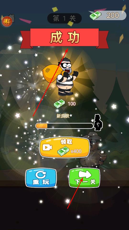 3、成功逃脫后,界面彈出成功提示,獲得金錢如100→200、新皮膚獎(jiǎng)勵(lì),點(diǎn)擊綠色下一關(guān)推進(jìn)關(guān)卡,或選重玩重復(fù)挑戰(zhàn)當(dāng)前關(guān)。