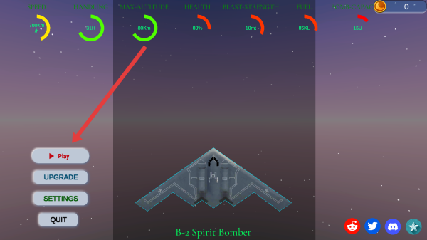 1、在B-2-Spirit-Bomber游戲主界面,點擊Play按鈕,進(jìn)入關(guān)卡,駕駛隱形轟炸機開啟空中作戰(zhàn)任務(wù),準(zhǔn)備打擊地面目標(biāo)。