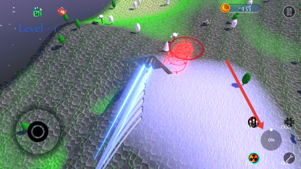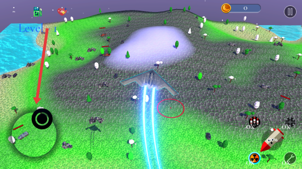 3、發(fā)現(xiàn)目標(biāo)區(qū)域后,點擊右側(cè)炸彈投放按鈕,向標(biāo)記點投擲炸彈,摧毀地面目標(biāo),推進(jìn)Level-1關(guān)卡的戰(zhàn)斗進(jìn)程。