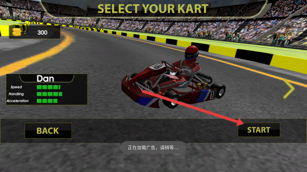 2、選定紅色卡丁車Dan后,點擊界面右下角START按鈕,進入比賽賽道,即將與其他車手展開競速對決,沖擊冠軍。