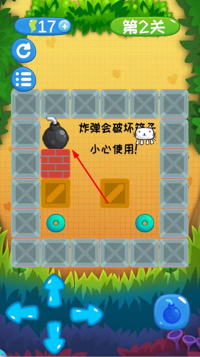 2、在操作過程中,合理使用炸彈,規(guī)劃貓咪的移動路線,避開障礙物,順利將箱子推到目標(biāo)點(diǎn)。