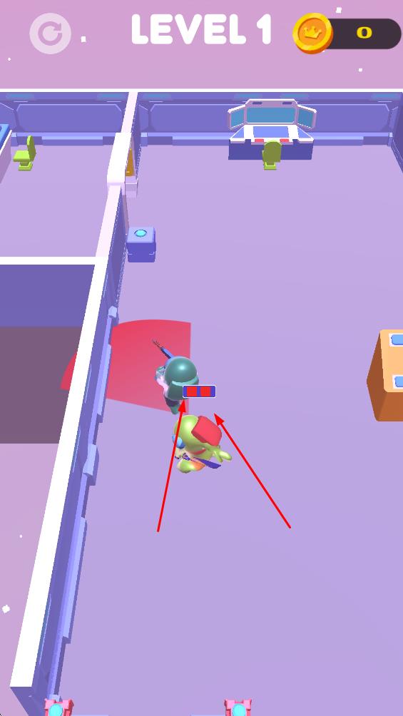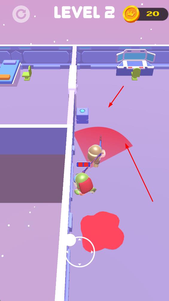 1、滑動(dòng)操控角色上下左右移動(dòng),避開敵人紅色視野區(qū)域,這是開啟潛行的關(guān)鍵操作。