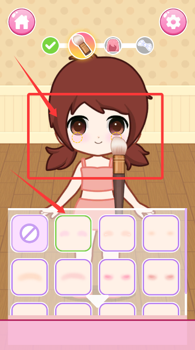 1、根據(jù)角色面部提示區(qū)域,選取合適腮紅顏色,使用化妝工具輕掃上妝。