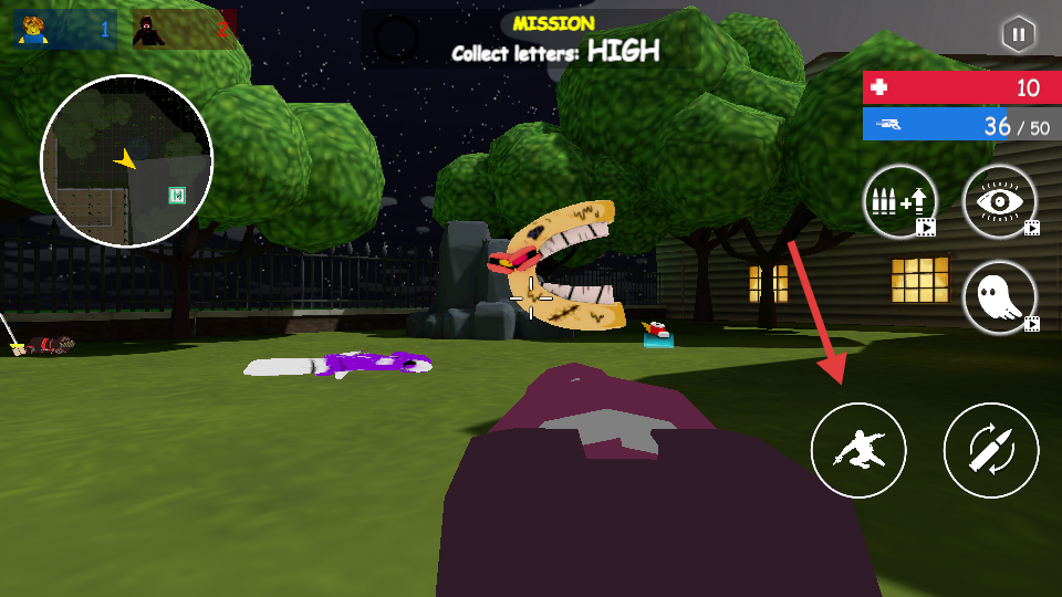 1、人類陣營通過拖動屏幕移動角色,點擊射擊按鈕消滅逼近的字母怪物。