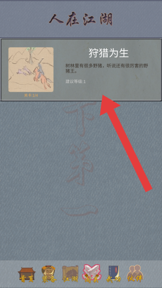 2、可點擊闖關(guān)的頁面,呈現(xiàn)了人在江湖的關(guān)卡,需要點擊狩獵為主進入到場景進行修煉技術(shù)。