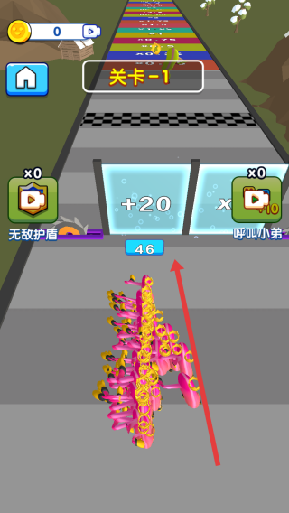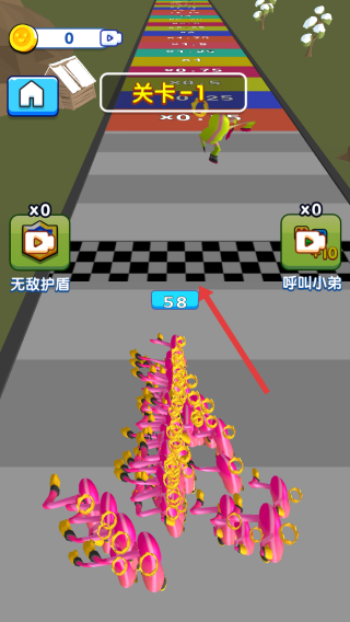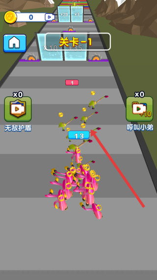 3、善用呼叫小弟功能看廣告獲次數,關鍵節(jié)點補充人數,沖向第一個關卡的終點,完成挑戰(zhàn)。
