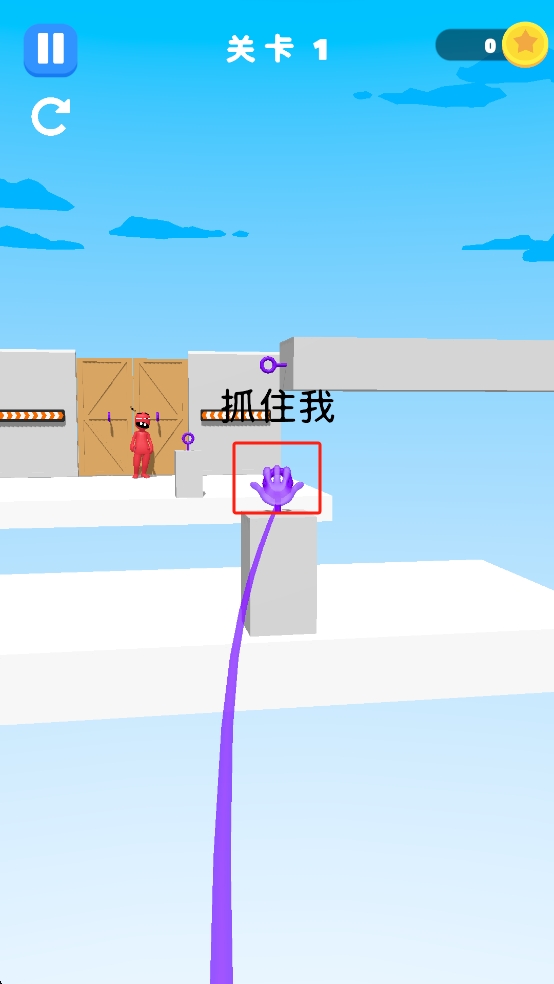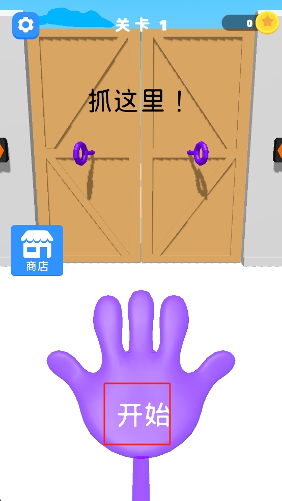 1、點擊紫色手掌上開始按鈕,操控紫色手掌瞄準門上紫色圓環(huán),按抓這里提示精準完成抓取動作開啟關卡挑戰(zhàn)。