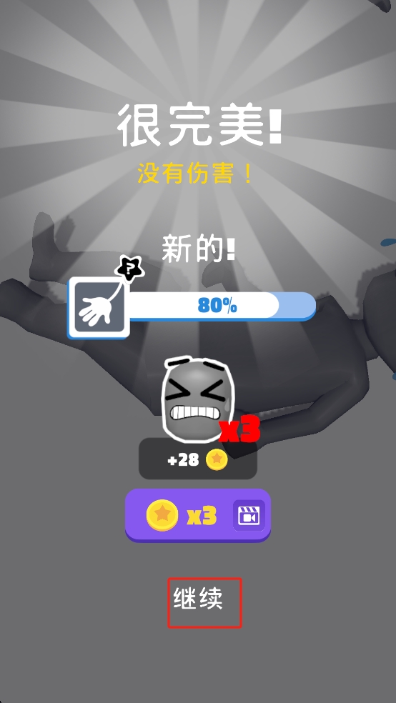 3、成功通關后,界面顯示相應的評價,還有金幣等獎勵,點擊繼續(xù)按鈕進入下一關開啟新抓取挑戰(zhàn)。