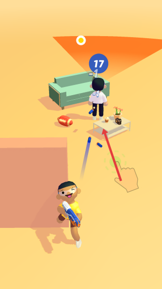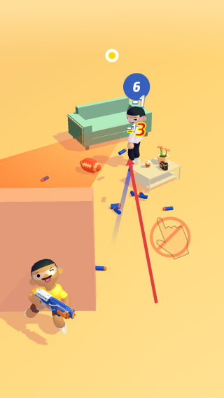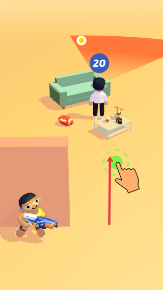 1、作為尋找者也就是拿槍的角色,射擊者點(diǎn)擊綠色的按鈕來瞄準(zhǔn),預(yù)判沙發(fā)后角色移動(dòng),射擊得分。