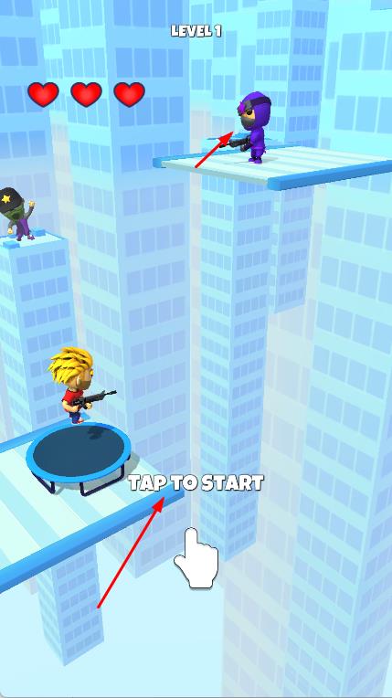 2、角色會(huì)借助蹦床彈起,在空中時(shí),操控角色移動(dòng)并瞄準(zhǔn)敵人,點(diǎn)擊屏幕進(jìn)行射擊,擊敗對(duì)手。
