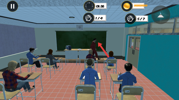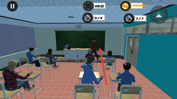 1、角色在教室移動,觀察老師所處的位置,優(yōu)先收集上方1/4等相關的道具也就是書本的圖標,靠近點擊拾取。