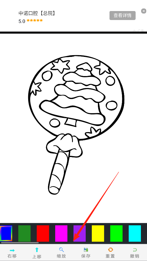 3、用底部色塊給圣誕棒棒糖上色,縮放功能可以調(diào)整細(xì)節(jié)部位,畫(huà)錯(cuò)時(shí)點(diǎn)撤銷按鈕,保存作品前還能用重置功能整體重來(lái),查看詳情能看到其他用戶的配色靈感。