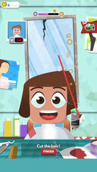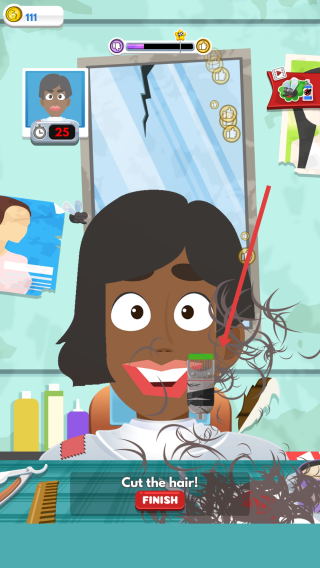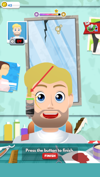 2、限時(shí)內(nèi)在左上角的倒計(jì)時(shí)完成的時(shí)候完成理發(fā),繼而點(diǎn)擊FINISH來(lái)交付,獲取金幣上方的數(shù)字顯示。