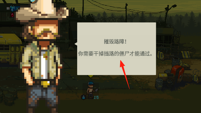 3、擊敗僵尸后,按照箭頭指引方向抵達(dá)路障處,完成破壞,推進(jìn)關(guān)卡,解鎖新區(qū)域劇情。