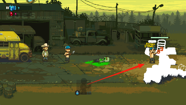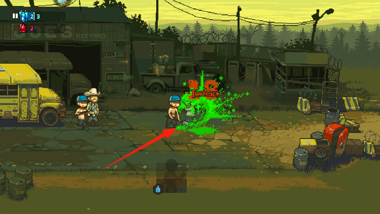 2、根據(jù)紅色箭頭指示操控角色持武器小人,攻擊僵尸綠色血霧特效,清理路徑敵人。