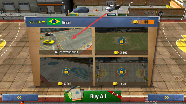 1、點(diǎn)擊主界面PLAY,進(jìn)入場地選擇頁,可解鎖SAINT PETERSBURG等場景,開啟街頭足球國家對抗賽。