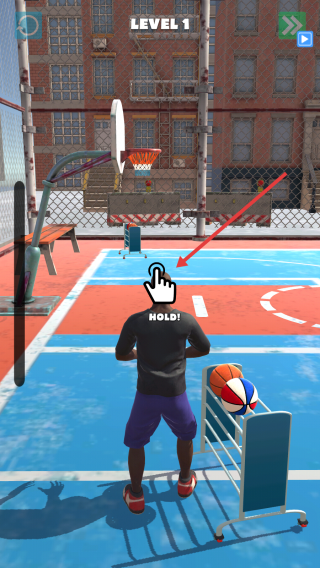 1、點(diǎn)擊街頭籃球場(chǎng)界面HOLD提示區(qū)域,進(jìn)入LEVEL1,在寫(xiě)實(shí)街球場(chǎng)景開(kāi)啟投籃挑戰(zhàn),準(zhǔn)備長(zhǎng)按觸發(fā)投籃流程。