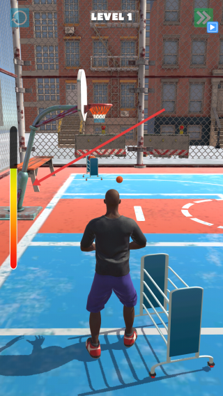 2、長(zhǎng)按屏幕時(shí)關(guān)注左側(cè)漸變力度條,把控蓄力強(qiáng)度,松開(kāi)手指讓籃球沿預(yù)判軌跡飛行,利用場(chǎng)景反彈等機(jī)制調(diào)整球路。