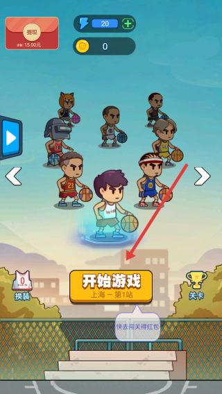 1、點(diǎn)擊開始游戲,選定球員,進(jìn)入籃球闖關(guān)游戲第001關(guān),在有上海地標(biāo)、萌趣角色的街道球場,開啟進(jìn)球1/3挑戰(zhàn)。