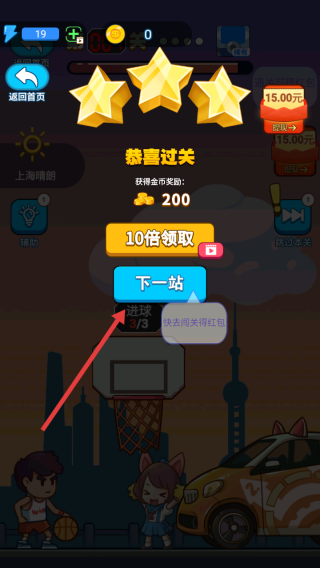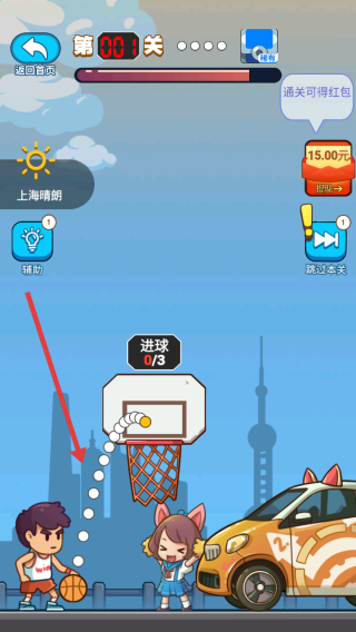 2、關(guān)卡內(nèi)滑動,點(diǎn)擊調(diào)整投籃軌跡,避開汽車、NPC干擾,讓籃球精準(zhǔn)入筐,完成指定進(jìn)球數(shù)推進(jìn)進(jìn)度,可借助輔助功能優(yōu)化。