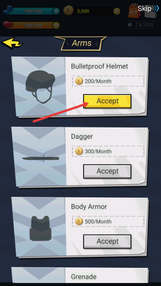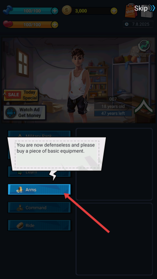 1、在游戲界面中,當(dāng)看到提示時(shí),點(diǎn)擊Arms按鈕,進(jìn)入武器裝備購(gòu)買界面,為角色購(gòu)買基礎(chǔ)裝備,提升角色的防御能力。