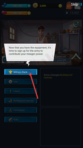 3、購(gòu)買裝備后,根據(jù)游戲提示,點(diǎn)擊Military Rank按鈕,報(bào)名參軍,為軍隊(duì)貢獻(xiàn)自己的力量,開啟新的游戲任務(wù)和挑戰(zhàn)。