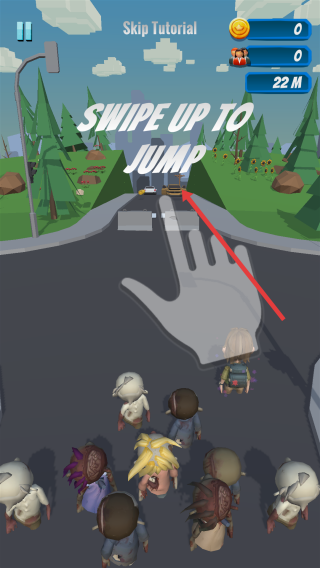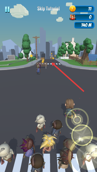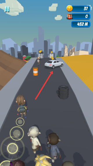 1、開始滑動屏幕來控制角色躲避僵尸群的變向,需要避開汽車、路障等障礙,最優(yōu)先收集路上金幣。