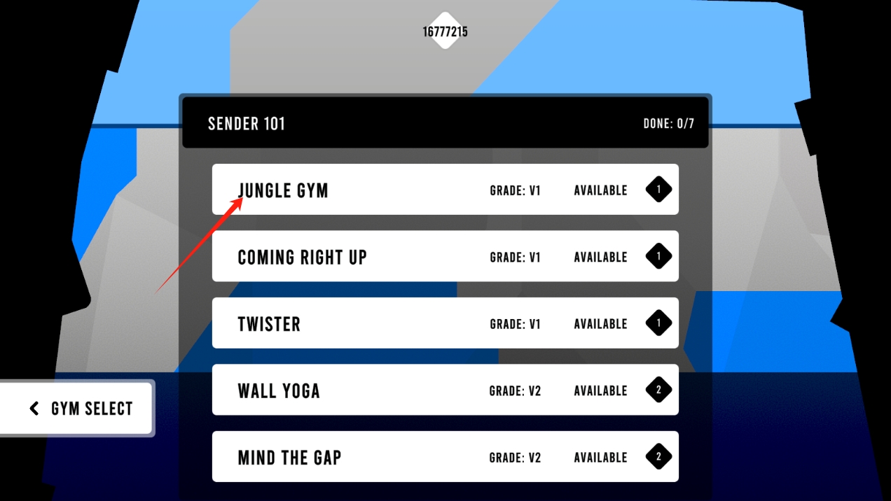 2、關(guān)卡選擇界面,挑選適合的攀爬關(guān)卡,如JUNGLE-GYM難度V1,開啟冒險。