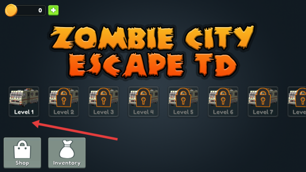 1、點(diǎn)擊ZOMBIE CITY ESCAPE TD主界面Level1,進(jìn)入第一關(guān)塔防地圖,準(zhǔn)備部署防御工事阻擋僵尸進(jìn)攻。