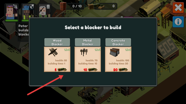 2、在建造彈窗選Wood Blocker,消耗5資源、血量50、建造時(shí)間1,點(diǎn)擊確認(rèn),解鎖基礎(chǔ)路障用于封阻道路。