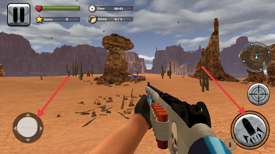 1、通過虛擬搖桿控制角色移動(dòng),右屏按鈕實(shí)現(xiàn)瞄準(zhǔn)射擊操作。