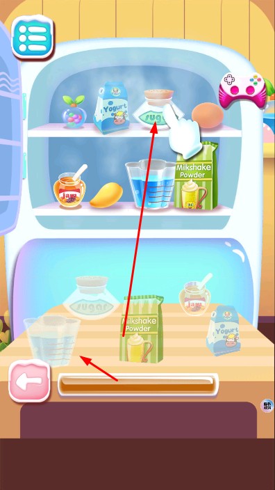 1、進入游戲,在初始界面中,從冰箱里選擇需要的原材料,點擊將其放置到操作臺上。
