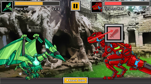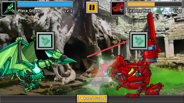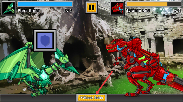 1、戰(zhàn)斗開始,點擊下方的Attack Guide開始,依據(jù)指引鎖定敵方Tyranno Red,準備發(fā)起首輪的攻擊。