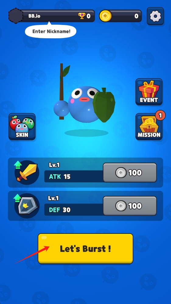 1、角色界面,設(shè)置昵稱,花費(fèi)100銀幣提升ATK和DEF屬性,點(diǎn)擊Let's-Burst!,開(kāi)啟BB.io的戰(zhàn)斗冒險(xiǎn)。