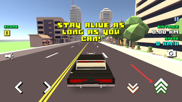 2、在駕駛過程中,利用屏幕上的方向控制按鈕,操控車輛在道路上行駛,同時注意躲避障礙物,盡可能長時間生存。