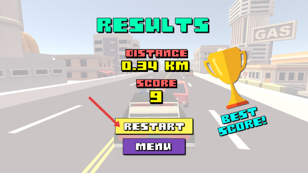 3、若游戲失敗,界面會顯示行駛距離和得分等結果,此時可點擊RESTART按鈕重新開始游戲。