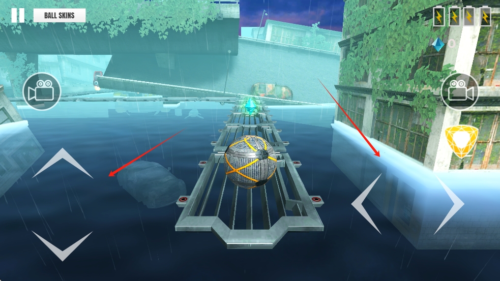 2、進(jìn)入關(guān)卡,用虛擬按鍵操控帶紋路的球,沿軌道前行,避開兩側(cè)水域與障礙物,朝著箭頭指引方向滾動(dòng)。