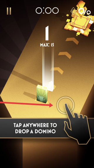 3、游戲過(guò)程中觀察骨牌下落時(shí)機(jī),當(dāng)出現(xiàn)TAP-ANYWHERE-TO-DROP-A-DOMINO提示時(shí),找準(zhǔn)時(shí)機(jī)點(diǎn)擊屏幕,在MAX-15的數(shù)量限制內(nèi)放下多米諾骨牌。
